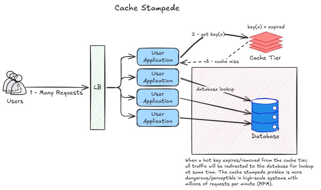 Cache stampede, também conhecido como thundering herd, é um problema que acontece quando uma hot key do cache expira ou é invalidada e, ao mesmo tempo, milhares de requisições concorrentes tentam acessar essa mesma chave.