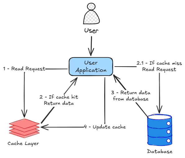 Uma das estratégias mais utilizadas na indústria é o padrão Cache-Aside também conhecido como Lazy Loading. Nesse modelo, a aplicação assume total responsabilidade por gerenciar o cache — decidindo quando ler, quando escrever e quando invalidar dados.