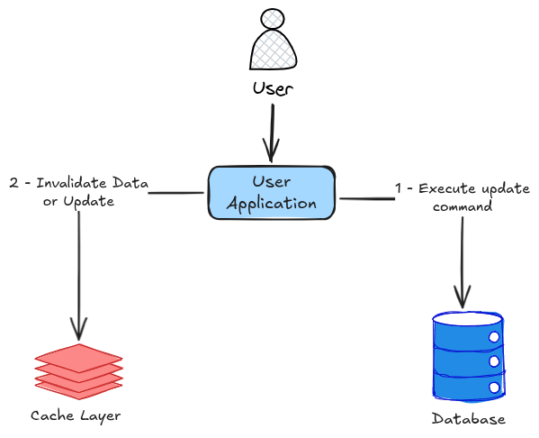 Diferente da leitura, o cache não é automaticamente atualizado. A aplicação precisa decidir o que fazer após modificar um dado no banco.